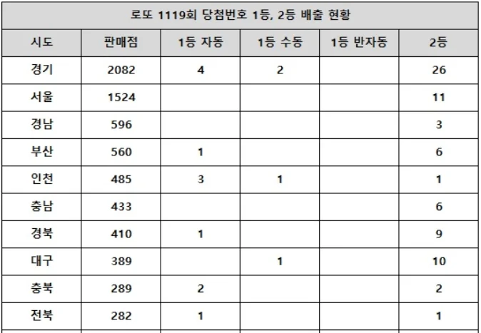 로또 1119회차는 많은 당첨자를 배출했으며, 특히 경기 화성시와 대구 북구의 로또 판매점이 주목받고 있습니다. 로또 구매자들은 운을 시험하며, 많은 사람들이 1등 당첨의 기쁨을 누렸습니다.
