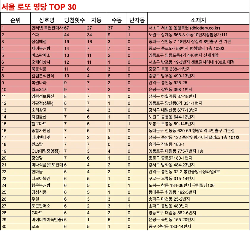 서울지역의 로또명당 순위는 총 30 곳으로 정리해 보았습니다. 너무 많아도 고르기 힘들잖아요?
