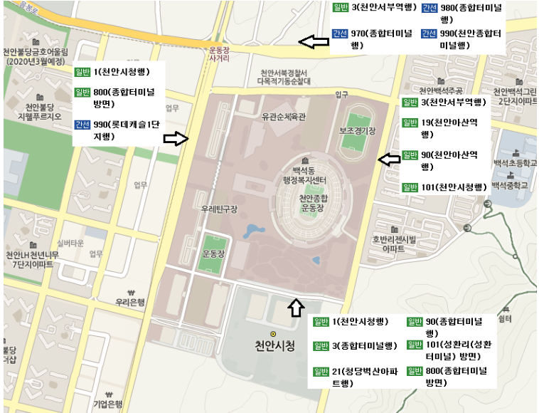 - 버스 : 103, 104, 106, 107, 114, 123, 127, 132, 411, 472번 (정류장 : 종합운동장 하차)